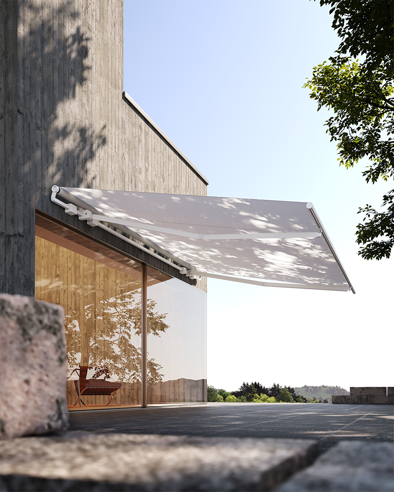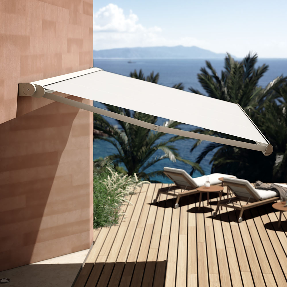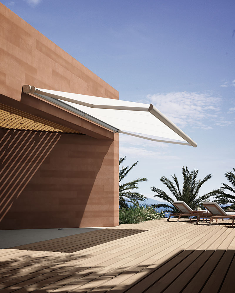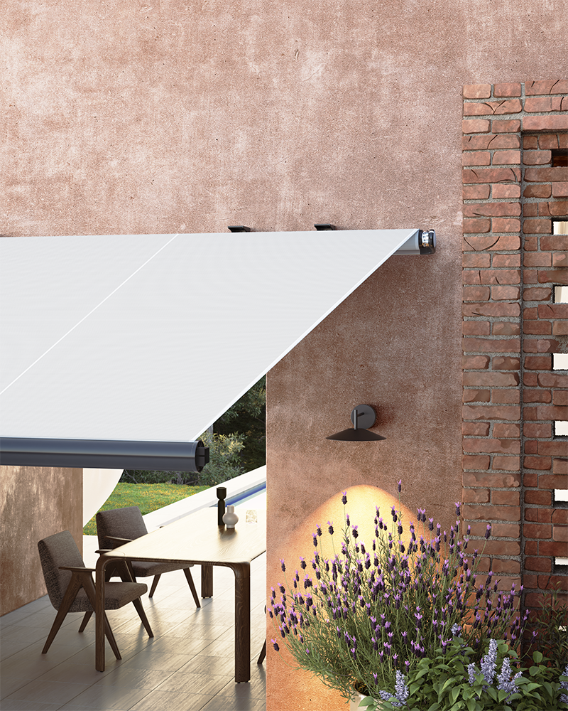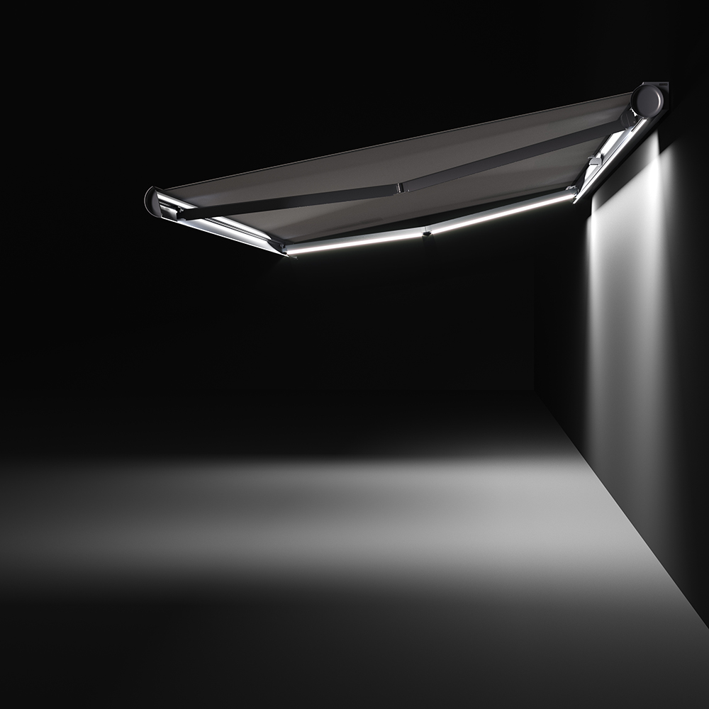 Δεν υπάρχουν ορατές βίδες, ούτε καν αυτές στις βάσεις στήριξης, με τοποθέτηση τοίχου ή οροφής, με πλάτος έως 7,00m και προβολή έως 3,65m και μπορεί να επεκταθεί έως 14,00m πλάτος με ένα ενιαίο ύφασμα και φωτισμό LED στην κασέτα και στους βραχίονες για μια άνευ προηγουμένου φωτεινότητα.