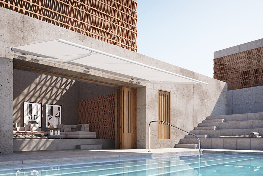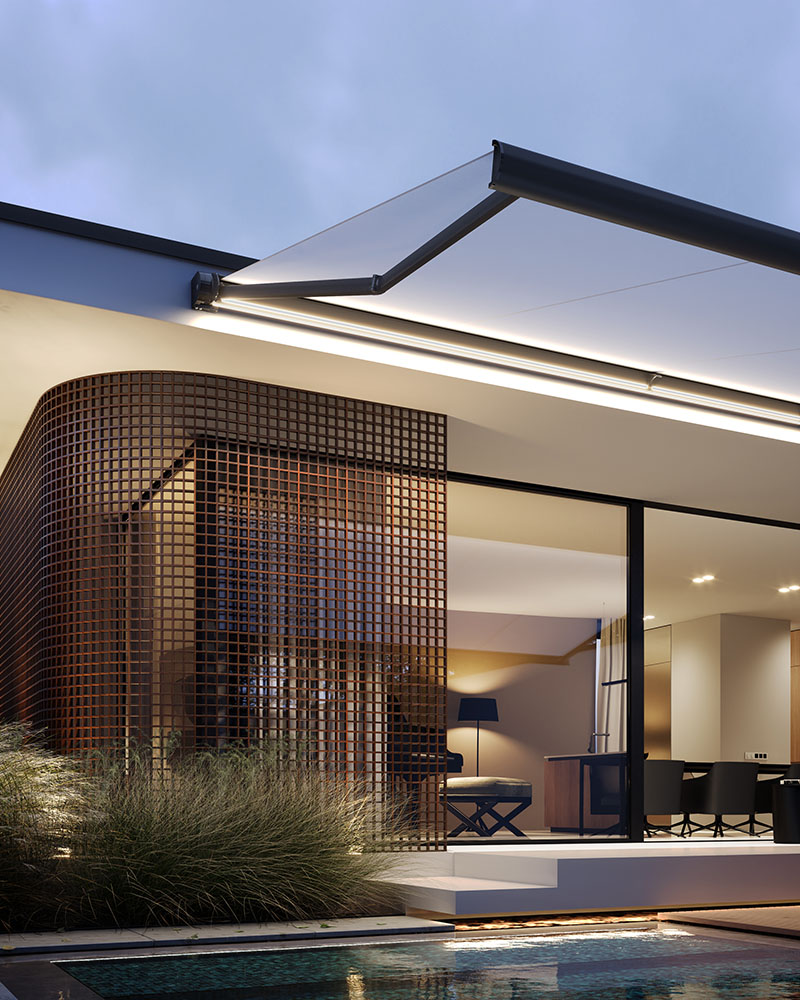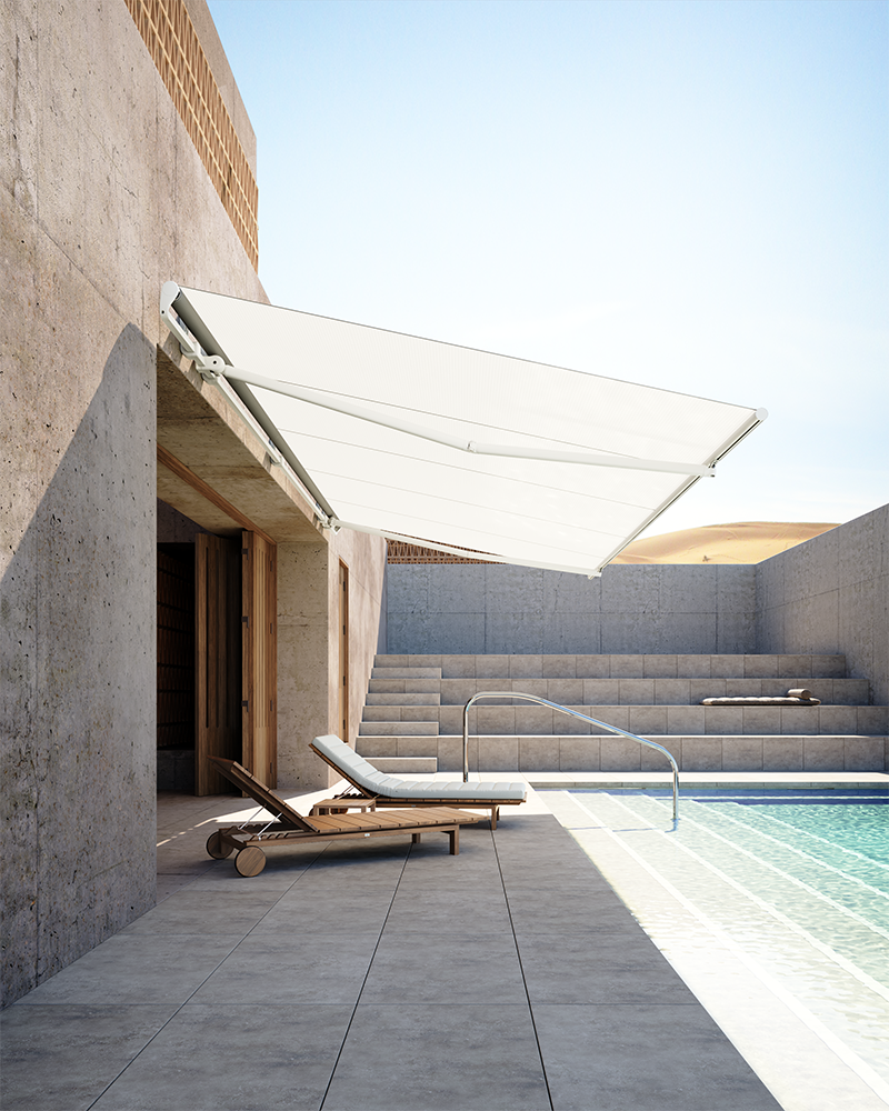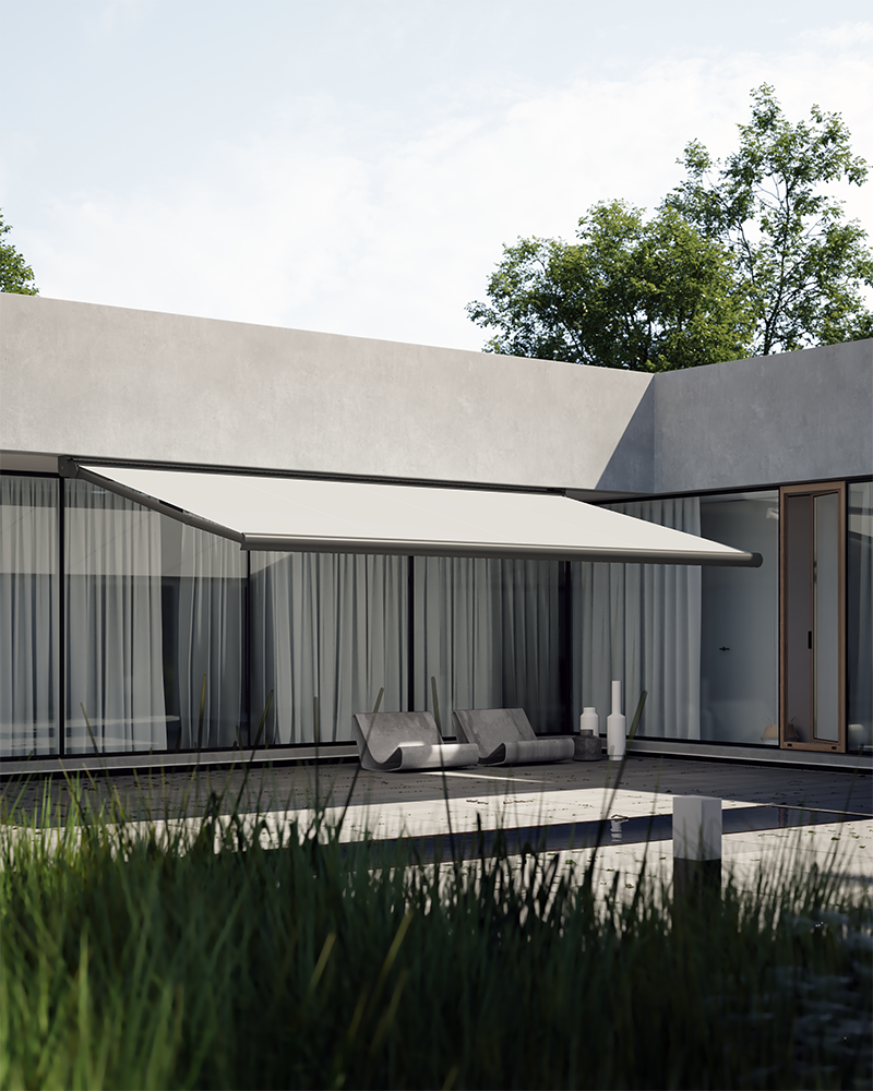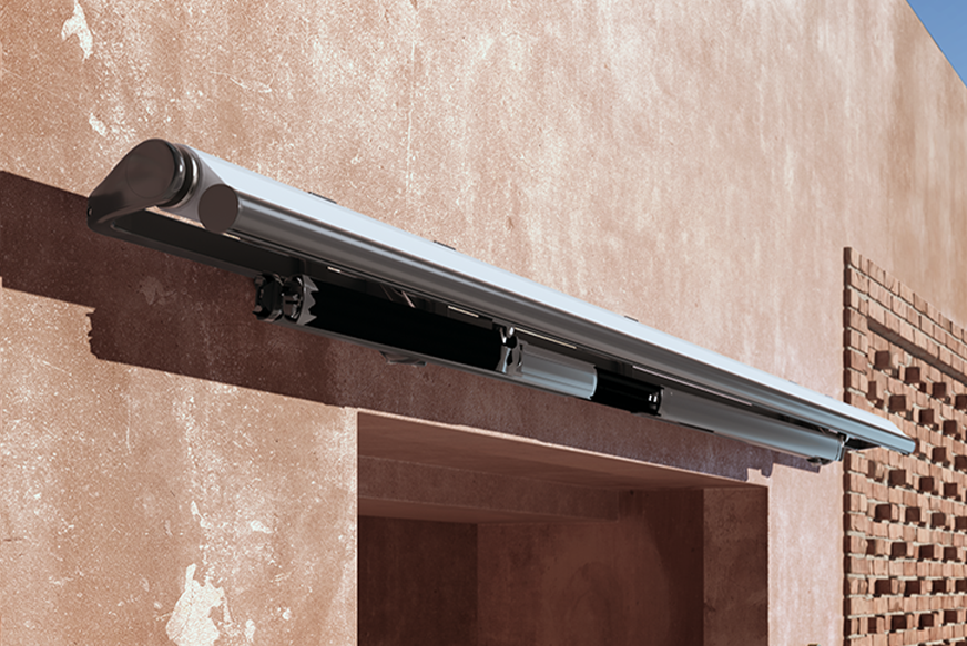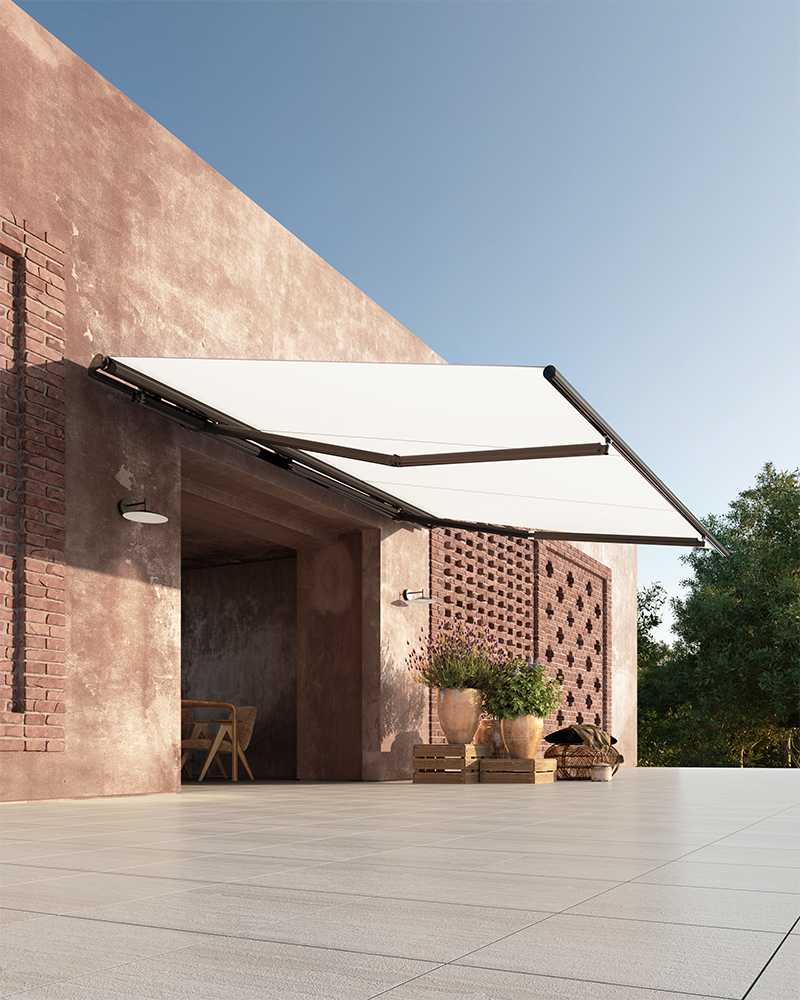 Δεν υπάρχουν ορατές βίδες, ούτε καν αυτές στις βάσεις στήριξης, με τοποθέτηση τοίχου ή οροφής, με πλάτος έως 7,00m και προβολή έως 3,65m και μπορεί να επεκταθεί έως 14,00m πλάτος με ένα ενιαίο ύφασμα και φωτισμό LED στην κασέτα και στους βραχίονες για μια άνευ προηγουμένου φωτεινότητα.