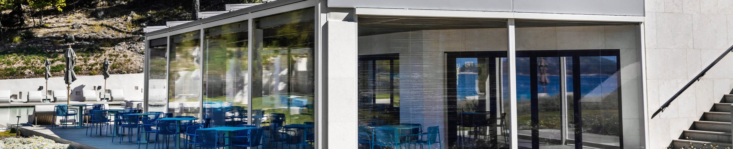 It ensures complete protection of your outdoor space from extreme weather without the need for vertical guides, preserving both the architectural aesthetics and the unobstructed view of the surroundings.